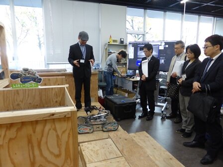 同大学エクステンションセンター客員講師 西山禎泰氏他より施設開設の経緯や概要などの説明を受け、隣接する「未来工房」の見学をした後、ミュージアム内の研究室で「鉄人ロボット」や「レスキューロボット」のデモンストレーションを見学した。研究室の垣根を越えた交流を通して問題解決を図る仕組みや、地域のイベントに学生が積極的に参加することで、地域との交流を持つなど、さまざまなコミュニケーションを通して「人材育成」に力を注ぐ大学の取り組みを理解することができた。